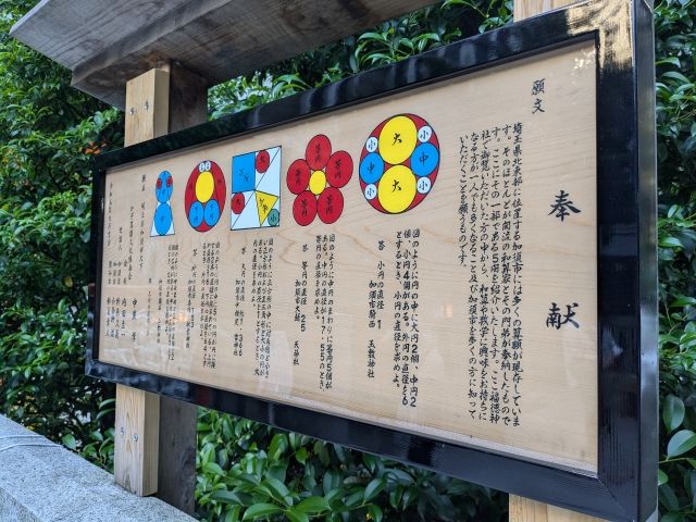 こちらの額に描かれているカラフルな模様のようなもの、これは算額と呼ばれる絵馬の一種。埼玉県加須市在住の方が奉納したものであるそう。