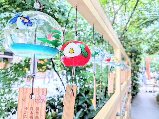 神社と福徳の森をつなぐ通路には、夏ならではの風鈴も並んでおります。色鮮やかなの風鈴たちは、爽やかな音色を響かせていました。