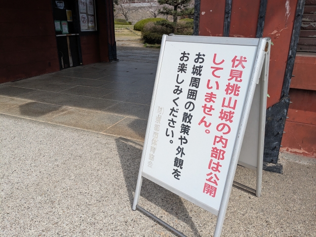 こちらの天守閣は、江戸時代以前から残っている天守閣「現存天守」でもなければ、城跡に資料をもとに再現された「復元天守」でもありません。さらに資料などが無く他の城を参考にした「復興天守」でもありません。かつて伏見城があったのはここではないため、本来天守がない場所に設置された天守閣風の建造物「模擬天守」なのです。