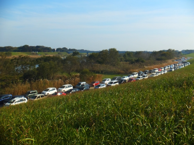 今回は一緒に行くメンバーで車を持っている方がいたため、交通手段問題も解決しました!土手に作られた臨時の駐車場には大量の車が並んでいます。砂利道で砂煙が凄かったので、車を汚したくない人はご注意ください。