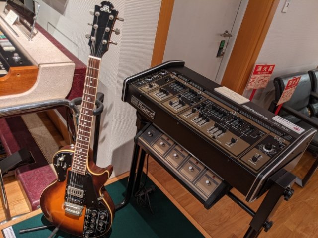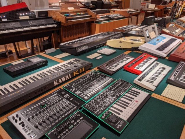 歴史ある楽器が多く展示されている中、目を引くのは電子楽器コーナー。「シンセサイザー」や「ハモンドオルガン」「エレキギター」など、現在のポップミュージックを組み立ててきた様々な楽器がびっしりと並んでいます。