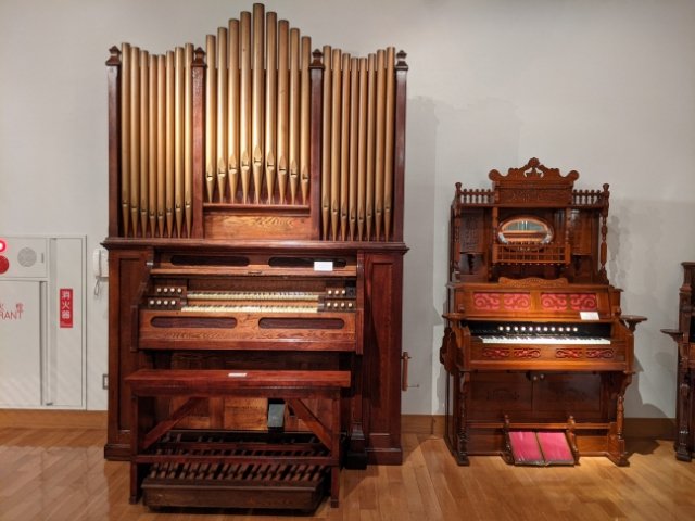 ピアノやオルガンなどの鍵盤楽器は専用の展示室が設けられています。こちらは大きな「リードオルガン」。2段式の鍵盤だけでなく、たくさんのペダルやストップレバーと呼ばれる音色を変更するスイッチが付いています。
