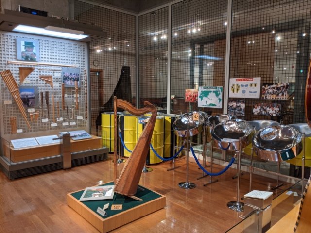 グアテマラの木琴「マリンバ グランデ」や、カリブ海の金属ドラム「スティールパン」など、中南米の楽器を中心に展示。こちらもアジア同様に、一発で雰囲気を作り上げる音。南米のフォルクローレ感や、中米の島国の陽気さがあふれ出てきます。
