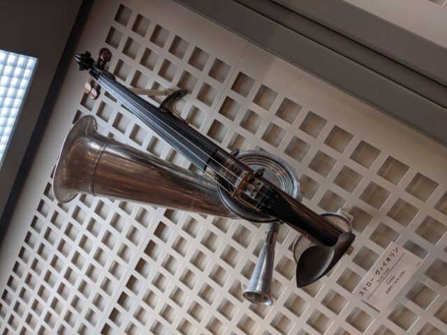 弦楽器と管楽器をむりやりフュージョンしたような不思議なカタチの「ストローバイオリン」。普通のバイオリンは木の箱型ボディで共鳴させていますが、こちらは金属板で共鳴させてラッパから音を出す仕組みになっています。