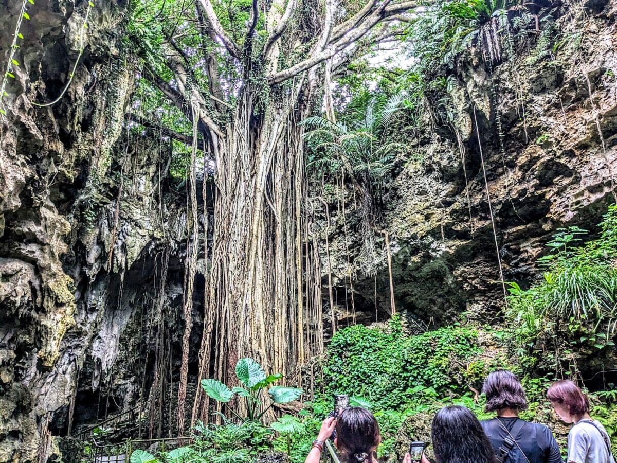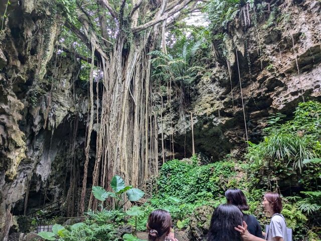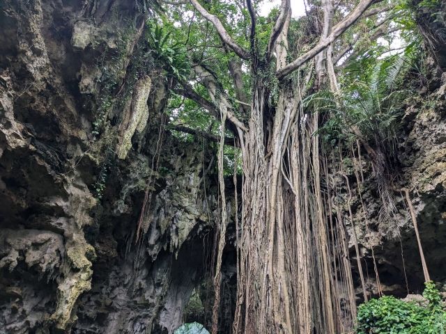 トンネルを抜けると、この洞窟最大の見どころとなる大主(ウフシュ)ガジュマルが姿を現します。谷状の地形の中心に堂々とそびえ立つ荘厳な姿に目が眩みます。