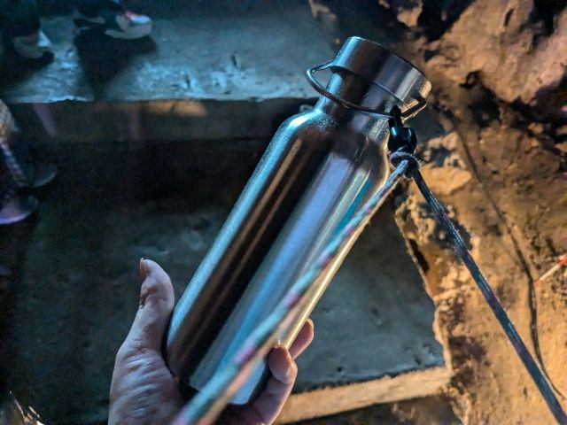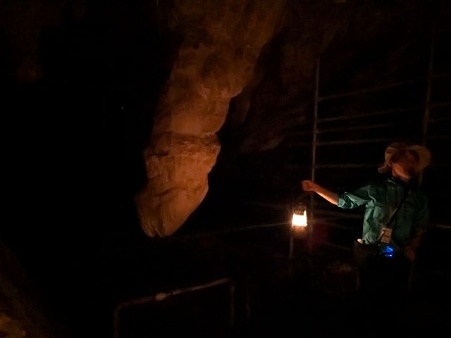 川が流れ込んでいるのはイキガ洞。ここではランタンを片手に真っ暗な洞窟の中へと進んで行きます。