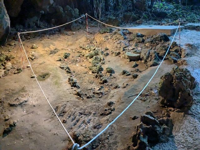 この武芸洞は明るくて風の通りが良く、人が住みやすそうな空間ということで発掘調査が行われました。その結果、焦げたイノシシの骨、爪形文土器、数千年前の石の棺などが出土。発掘された人骨は貝殻のビーズの腕輪をしていたそうです。