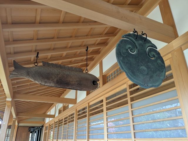 吊り下がるのは雲板と魚鼓。どちらも叩いて音を鳴らし、時を知らせるためのものです。禅宗、特に曹洞宗の寺院で見かけることが多いです。