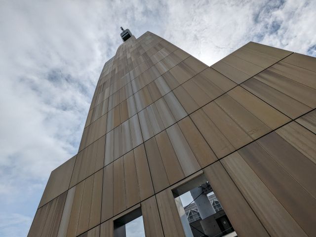 その高さは125m。見る角度によって姿が変わり、西側のプレート側から見るとベージュの平面的な姿。