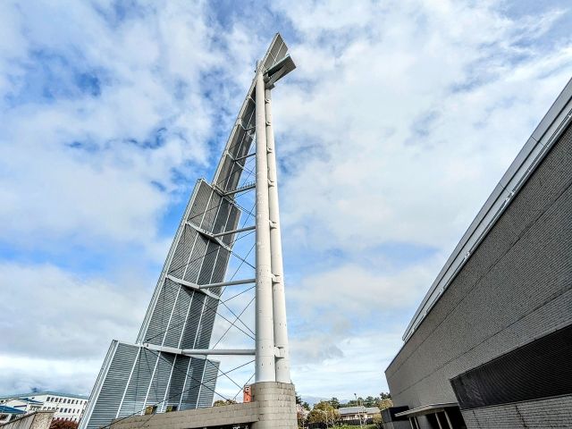 タワーも含めた全体の設計は大分県出身の世界的建築家、磯崎新氏。茨城県の「つくばセンタービル」や「群馬県立ぐんま天文台」など、全国各地に作品を残す建築家です。もともとはシンボルとして設計されましたが、せっかくだからと展望台付きになったそう。