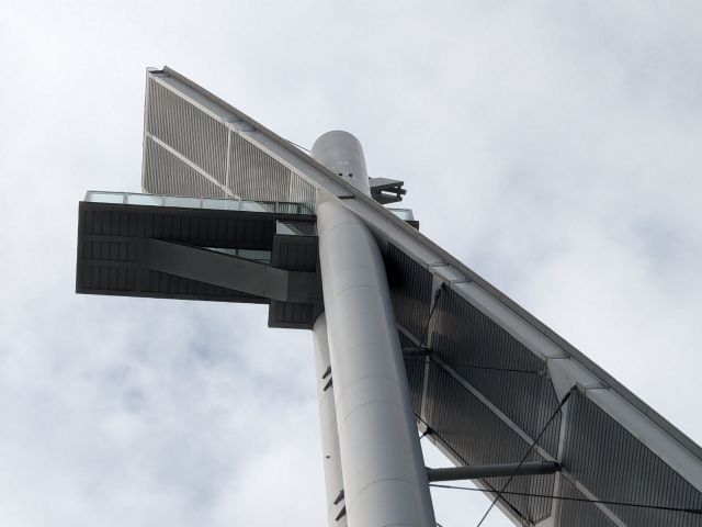それがこちらのグローバルタワー。2本のポールで構成されており、それを支えるようにゆるいカーブを描くプレートが添えられています。