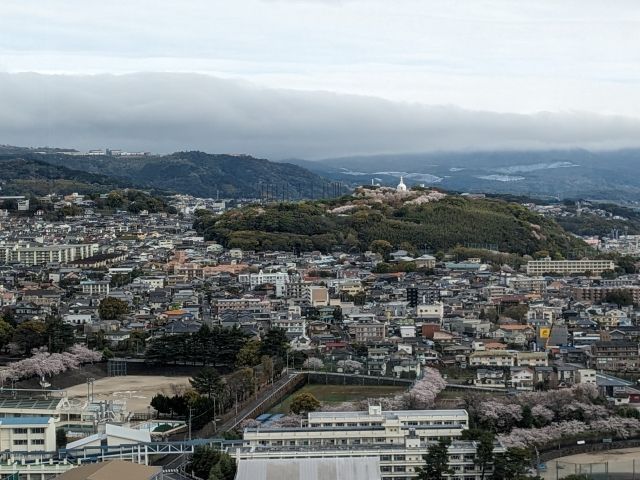 北側は桜に包まれた「仏舎利塔」。すこし目線をずらすと、大きなさんふらわあが停泊する「別府国際観光港」も見えます。