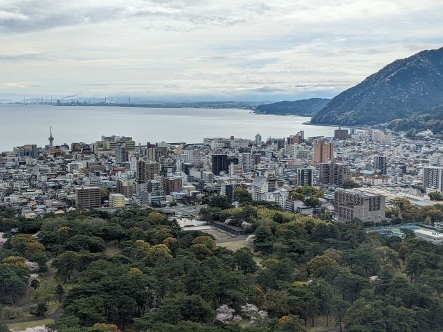 東側は、手前に自然豊かな「別府公園」、その奥はマンションや温泉旅館が立ち並ぶ「別府駅」周辺。さらに奥は「別府タワー」が高くそびえ立ち、海の向こうには大分市の工場地帯まで広く見渡せます。