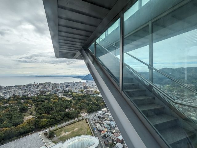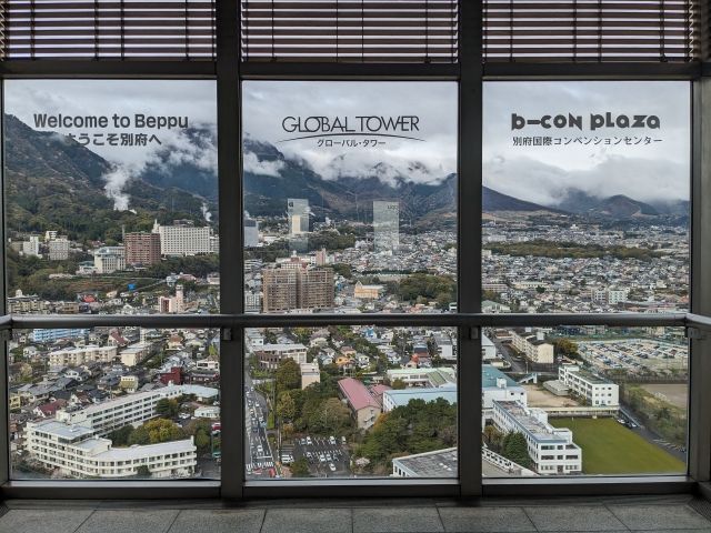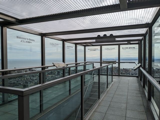 3階の高さ96mの展望フロアは、一面ガラス張りの壁。目の前には湯けむりが立つ別府のまちが広がり、開放感抜群です。
