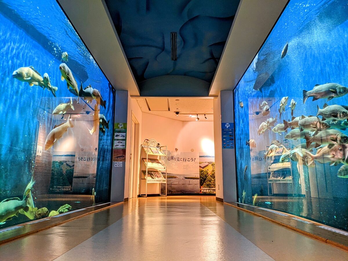 宍道湖自然館ゴビウスは、宍道湖や中海といった島根県の湖や川に暮らす生き物を飼育・展示した水族館。宍道湖の西岸、宍道湖グリーンパークに隣接する形で2001年にオープンしました。