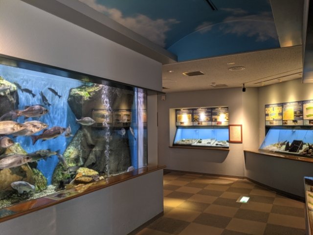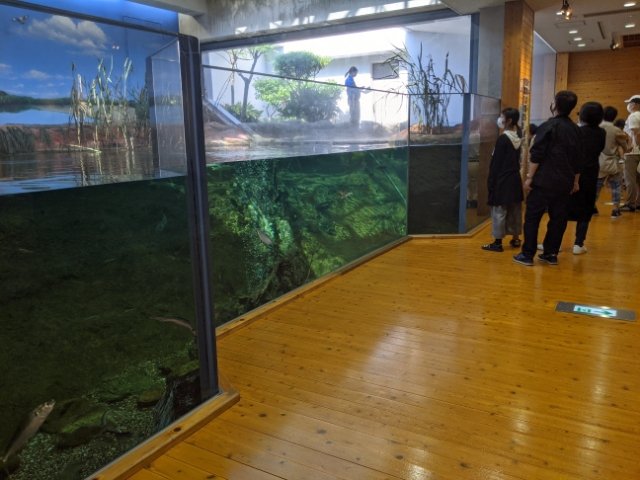 展示水槽の多くは、宍道湖と中海それぞれをテーマにしています。自然環境をリアルに再現したジオラマ水槽も、真ん中で中海と宍道湖にわかれています。