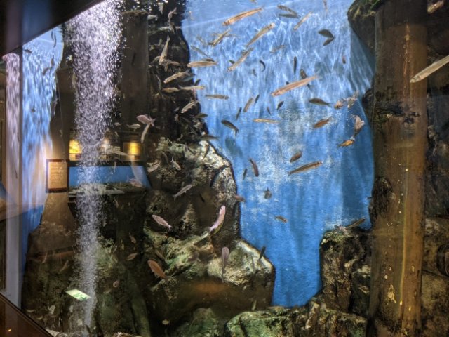 一方、宍道湖の塩分濃度は0.3%。宍道湖水槽では、ワカサギやギンブナなど淡水魚がメインです。小型のサカナが中心かと思いきや、コイやウナギ、そしてアリゲーターガーやカムルチーなどの外来種なんかもいます。