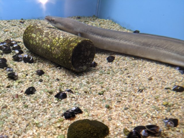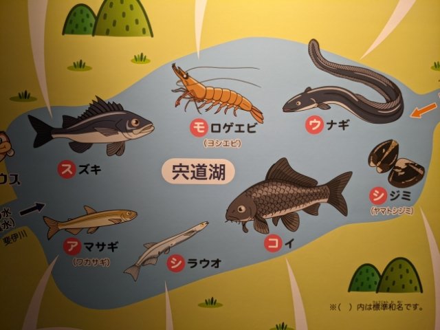大型水槽は「宍道湖と川」と「中海と海」の水槽が向き合う形で設置されており、それぞれを見比べて楽しむことができます。すぐ近くの湖なのに生息している生き物にはけっこう違いがあるようです。いったい何が理由なのでしょうか。