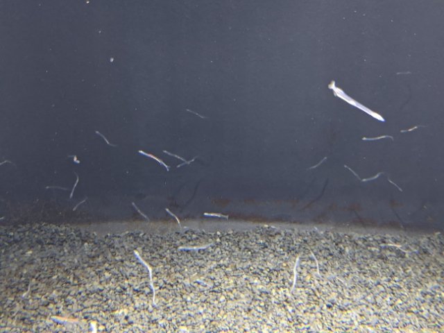 まるで糸くずのようにただよう白いものはシラウオ。透き通った体がライトに照らされてキラキラ輝きます。泳ぎ方もふよふよとしており、まるでクラゲを見ているかのような癒やし。全国の水族館で初めて1年間の継続展示に成功、さらに人工繁殖にも成功しているそう。(※ちなみにシロウオとは別のサカナです。)