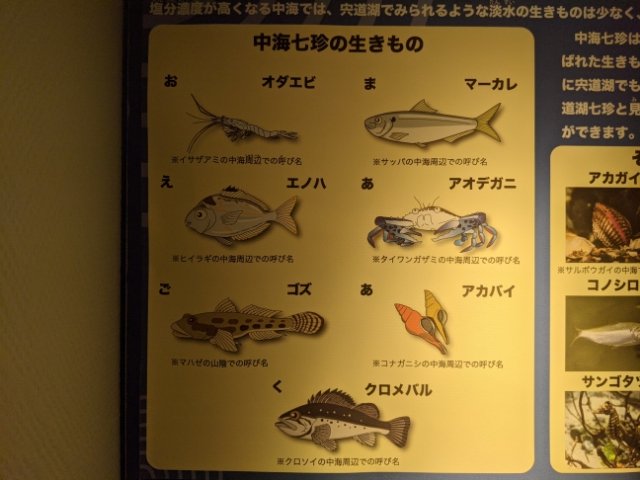 七珍は宍道湖だけでなく、中海にもあります。中海七珍はオダエビ、マーカレ(サッパ)、エノハ、アオデガニ、ゴズ(マハゼ)、アカバイ(コナガニシ)、クロメバル(クロイソ)。