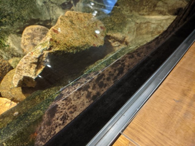 最大の両生類、オオサンショウウオの姿も。山陰地方ではハンザケと呼ぶそうです。まったく動かないので見ごたえはあまりありません。