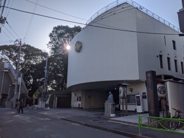 お寺の入り口は、交通量の多い山手通りから細い道に少し入ったところにあります。知らないとお寺とは思えないような真っ白で近代的な建物。大きく掲げられた葵の御紋が輝きます。拝観料は500円です。