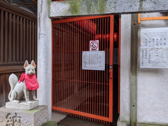 周辺を探すと、フェンスの扉を見つけました。そこには「ご参拝の御方は扉を開けてお入りください。」の表記が。狐様がこちらをじっと見つめているように感じるのは、気のせいではないでしょう。