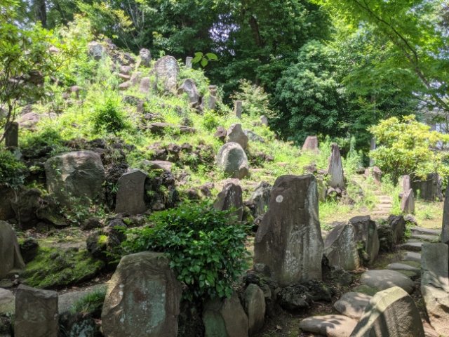 不老門の手前で右へ進むと、石が積まれた小さな山が見えてきます。こちらは音羽富士と呼ばれる富士塚。