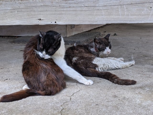 今回は7月の暑い日に訪問したためか、ネコはどこかで避暑している様子。全然いないなーと思っていると、薬師堂の周りを囲む縁側の下に2匹だけ見つけました。