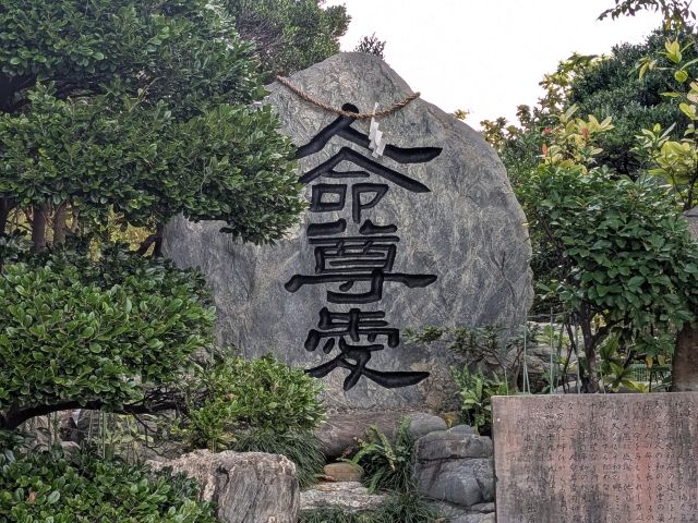 鳥居をくぐるとすぐに見えてくるのは人命尊愛神石。世界の平和を祈念して昭和49年(1974年)に建立されたものです。