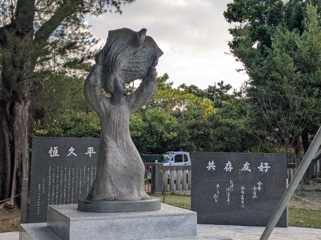 奥武山公園内に鎮座する、戦没者の御霊を祀る護国神社。参道に並ぶ像や記念碑には、戦争の恐ろしさを忘れないという思いと平和への祈りが込められていました。