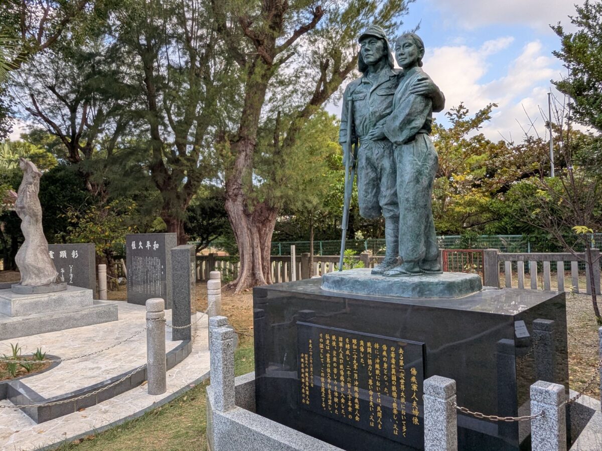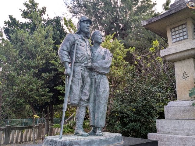 片足を失った男性とそれによりそう女性が描かれた傷痍軍人夫婦像。軍人に限らず民間人も多く犠牲となった沖縄戦、傷つき困難な日々を過ごした夫婦の姿は、痛々しくも力強く感じました。