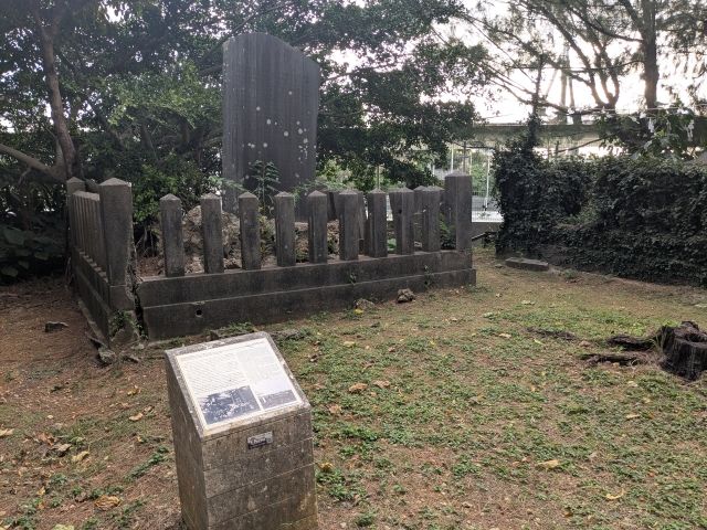 この後は、すぐ近くの沖宮へと向かいます!最初の鳥居向かって左側の細い道を進んでみると、開祖記念碑が。沖縄県の土地・租税制度の改革である土地整理事業の完了、そしてこの事業を推進した第8代沖縄県知事・奈良原繁の実績を讃えた記念碑であるそう。