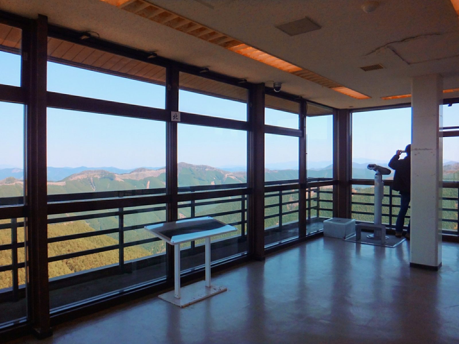 視界には、紀伊山地の深い山々が広がります。タワーそのもは高さ33mとそれほど高くはありません。しかし、ここは標高1,282m地点なので、展望室の標高は1,306m。おそらく日本一の標高のタワーではないでしょうか。