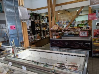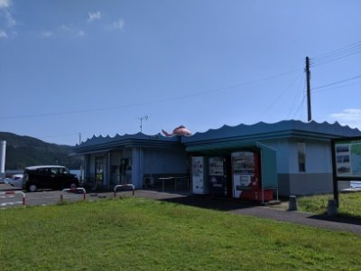 港にある観光物産館・しおさい館。おみやげや海産物、観光案内所を兼ねた、小さな道の駅のような施設。