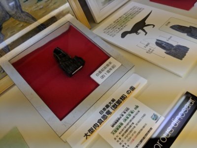こちらの赤い布が敷かれているのは日本最大級の大型肉食恐竜の歯の化石。欠けている部分を復元すると10cmになり、推定10m以上の大型の恐竜だったことが予想されているそう。