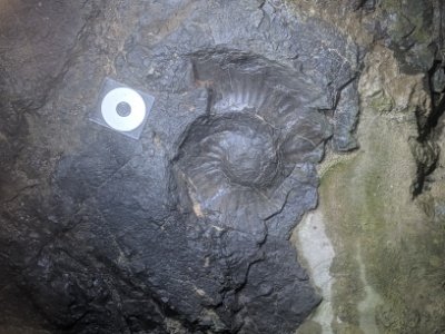 あれっと思い、中を覗きこむと地層に埋まるアンモナイトの化石が!アンモナイト館は、なぜこんな町のはずれにあるのだろうと思っていたのですが、これは発掘された場所でそのまま展示しているからなのでしょう。