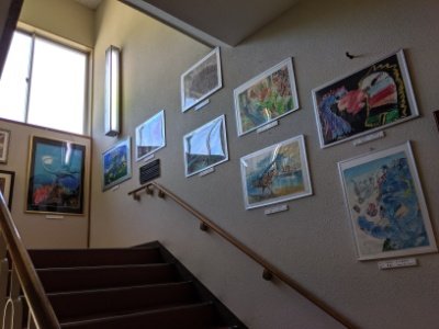 階段には、地元の小中学生が描いた恐竜の絵。小さい頃にたくさん恐竜の絵を描いていたのを思い出しました。