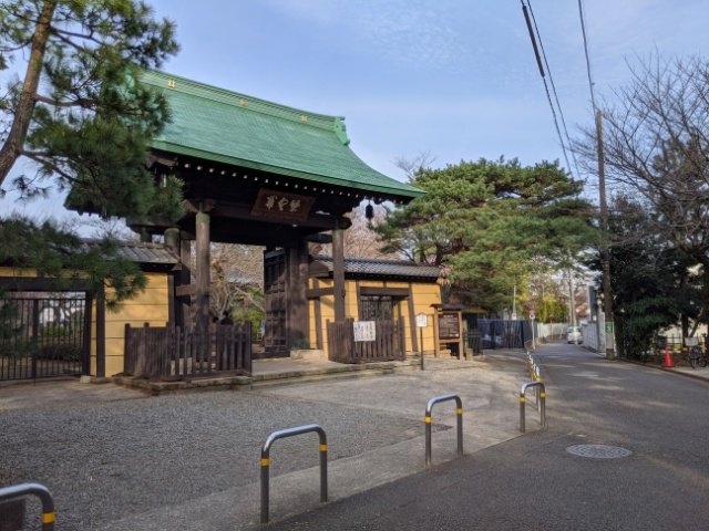 世田谷の住宅街の中に突如現れる山門。あざやかな緑色の屋根がとても奇麗です。