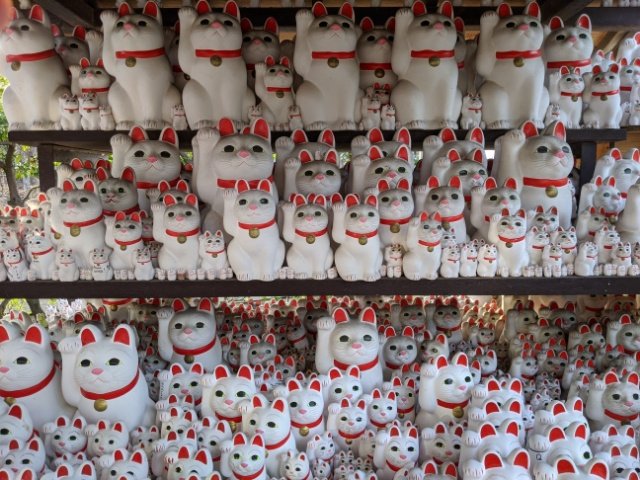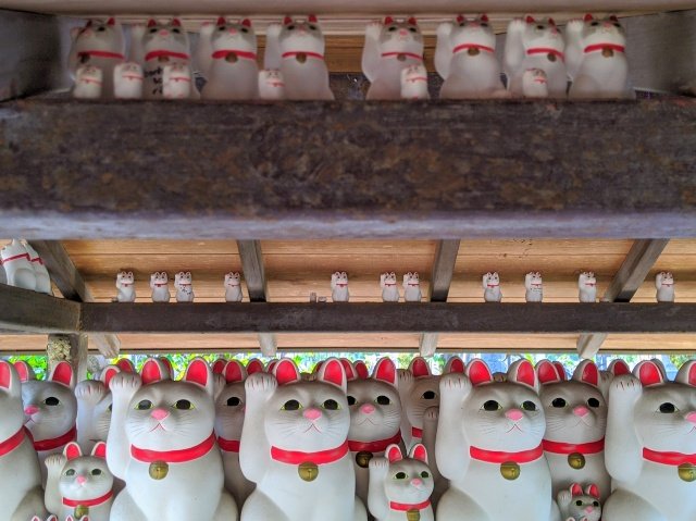 招き猫の寺として有名な世田谷区の寺院。大小さまざまなおびただしい数の招き猫はとにかく圧巻です。平成に造られた三重塔にもネコが隠れています。