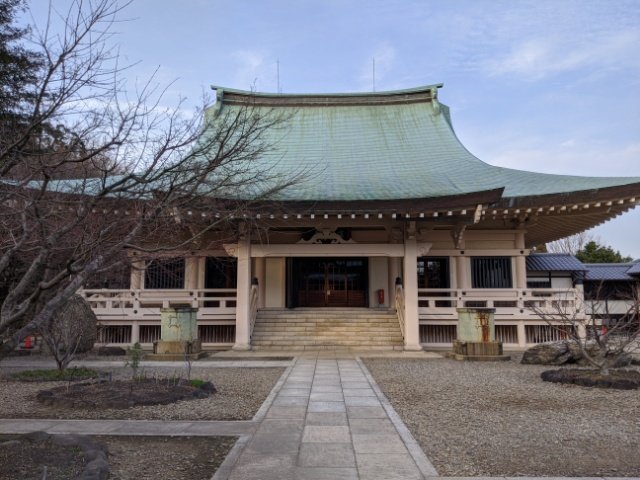 本堂はずっしりとしたコンクリート仕立て。山門と同じ緑色の屋根と、クリーム色の柱の組み合わせがマイルドです。街中の小さなお寺をイメージしていたのですが、境内は想像以上に広く、伽藍も大きく立派です。