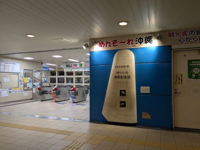20:30頃に到着した那覇空港。空港内にある「そば処琉風」でソーキそばの夕食を済ませ、ゆいレール乗り場へ。那覇空港駅って、実は日本最西端の駅なんですよね!