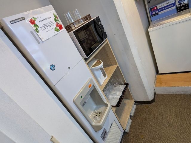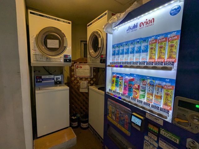 コインランドリーも1階にあります。洗剤はフロントにて販売。隣の自販機にはさんぴん茶や沖縄バヤリースもそろってます!