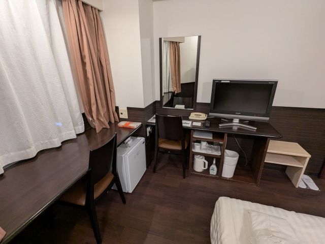 シンプルでとってもキレイなお部屋。けっこう広々としているので、スーツケースを広げるスペースはばっちり。窓際のデスクだけでなく、ミラー台もあって、荷物を置くところがたくさんあるのが嬉しい。