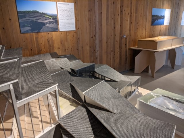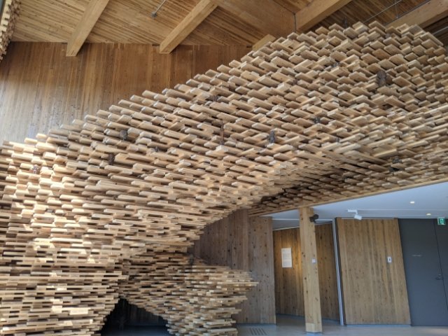 ミュージアム館内は木造の内壁のいたる所に木組みの装飾が施されており、隈研吾の世界が広がります。大きな窓から降り注ぐ自然光が心地よい空間です。