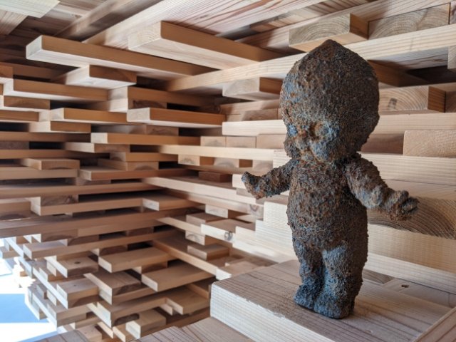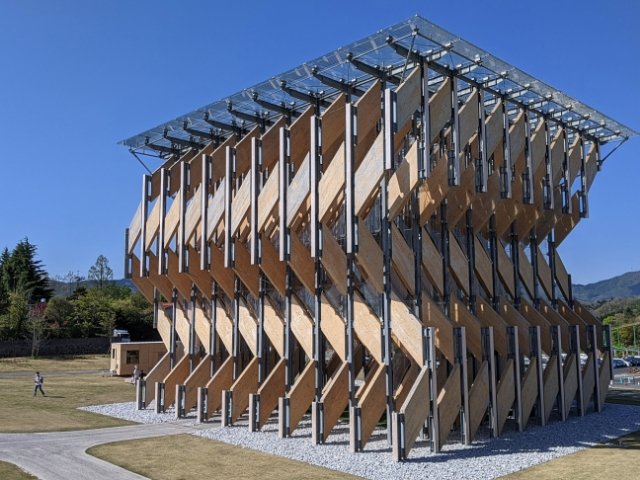 目を引くのは、ミュージアムの目の前に建てられた巨大な木造オブジェ。こちらはパビリオン「風の葉」。真庭市産のCLT(直交集成板)によって造られています。