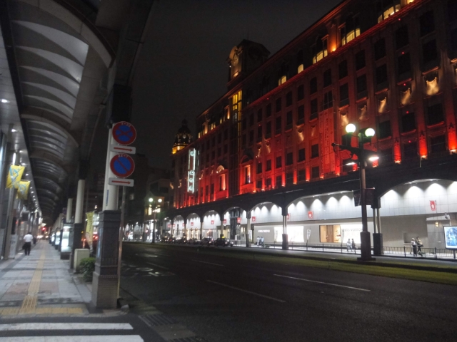 赤く輝いているのは、鹿児島を代表するデパート山形屋(やまかたや)。ルネサンス調の外観が重厚感あります。