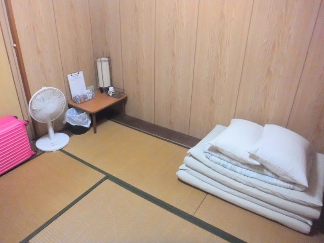 今回は個室を利用しました。4.5畳のシンプルだけどきれいなお部屋で、扇風機とエアコンは備え付け。南京錠タイプのカギも取り付けられています。