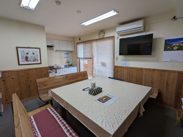 靴を脱いで階段を上がると宿泊エリア。テーブルと椅子が置かれたリビング風の共有スペースもあります。