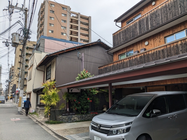 京都駅から北へ伸びる烏丸通から少し裏手に入ったところにあります。焼杉の外壁が趣ある外観です。